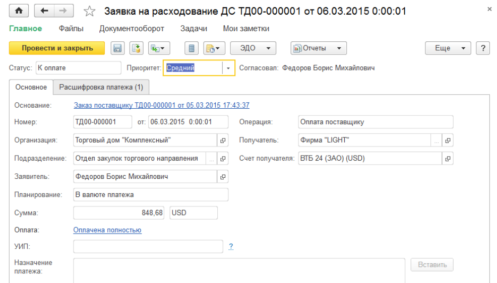 Если требуется осуществить расходование денежных средств сверх установленного для статьи ДДС лимита, данная потребность указывается при оформлении заявки на расходование денежных средств (в заявке устанавливается признак Сверх лимита).