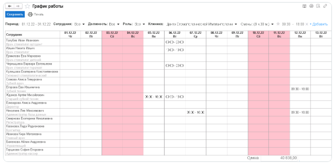 Решение обеспечивает планирование графика работы сотрудников и учет фактически отработанного времени работы персонала, формируются отчеты по персоналу (возвратность клиентов, взаиморасчеты с персоналом, расшифровка начислений и удержаний и другие отчеты).