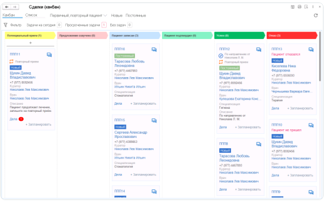 Полный контроль сделок по первичным и повторным пациентам. Возможность настройки собственных сделок с указанием этапов. Автоматическое движение пациента по этапам сделки.