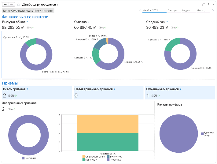 Детальная информация руководителю для оперативного управления клиникой – структура записей, выручка, сумма оказанных услуг, средний чек, статистика приёмов, загрузка врачей, стоимость часа работы врачей.