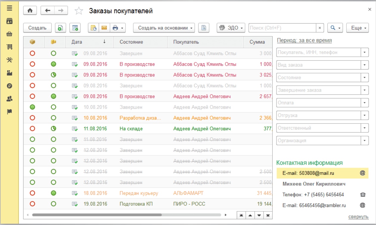 - Работа с единой базой заказов, прозрачный учет и контроль их исполнения.